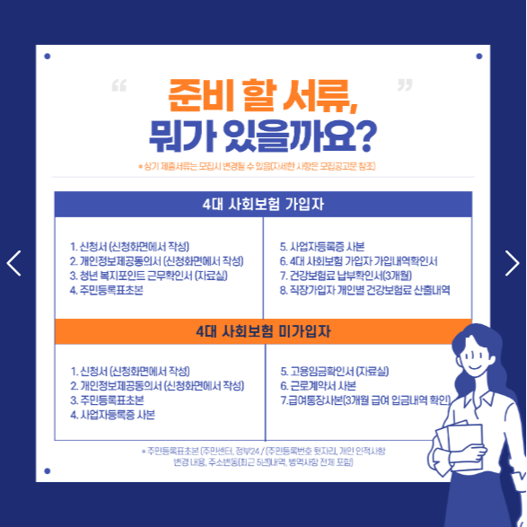 | 4대 사회보험 가입자 | 1. 신청서 (신청화면에서 작성) 2. 개인정보제공동의서 (신청화면에서 작성) 3. 청년 복지포인트 근무확인서 (신청화면에서 작성) 4. 주민등록표초본 (주민센터, 정부24 / (주민등록번호 뒷자리, 개인 인적사항 변경 내용, 주소변동(최근 5년)내역, 병역사항 전체 포함)(링크) 5. 사업자등록증 사본 (근무처) 6. 4대 사회보험 가입자 가입내역확인서 (4대사회보험정보연계센터)(링크) 7. 건강보험료 납부확인서(3개월) (국민건강보험공단 홈페이지)(링크) 8. 직장가입자 개인별 건강보험료 산출내역(국민건강보험공단 홈페이지)(링크) - 마이데이터 동의자 : 직장가입자 보험료 개인별 상세조회 - 마이데이터 미동의자 : 건강보험료 납부확인서, 직장가입자 보험료 개인별 상세조회 ※상기 제출서류는 모집시 변경될 수 있음(자세한 사항은 모집공고문 참조) |